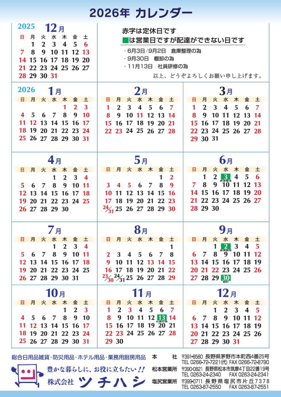 営業日カレンダー - 株式会社ツチハシ 公式サイト